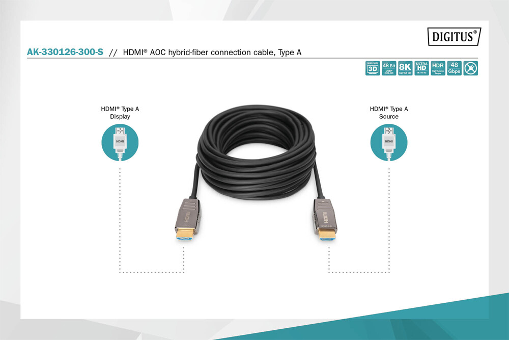 Dieses aktive HDMI® AOC Hybrid-Glasfaserkabel eignet sich ideal, um unkomprimierte Video- und Audiodaten mit hoher Bandbreite über längere Distanzen zu übertragen. Durch die Hybrid-Konstruktion von Kupfer- und Glasfaserleitern sind elektromagnetische Einflüsse ausgeschlossen, dies gewährleistet eine verlustfreie Übertragung über die gesamte Kabellänge mit UHD-Auflösungen von bis zu 8K/60Hz und Bandbreiten von bis zu 48 Gbps. Durch den Einsatz von optischen Leitern (Glasfaser) ist der Durchmesser dieses aktiven Kabels sehr gering und zeichnet sich durch sehr kleine Biegeradien sowie ein geringes Eigengewicht aus. Der Ideale Einsatz für Heim, Meeting- oder Konferenzräume sowie innerhalb von Gebäuden stellen nur einige der Einsatzgebiete dar. Die benutzerfreundliche Installation erfolgt hierbei durch einfaches Plug and Play, einstecken und sofort höchste Bildqualität genießen. Unterstützt werden zahlreiche Standards, wie z.B. HDMI 2.1, HDCP 2.2 oder HDR. Im Audiobereich werden unter anderem ARC, DTS-HD Master Audio oder Dolby TrueHD sowie viele weitere Features unterstützt. Der Einsatz neuester Chiptechnologie ermöglicht die Übertragung des vollen HDMI®-Signalspektrums und unterstützt dabei CED, EDID mit sehr geringer Latenz und unkomprimiert