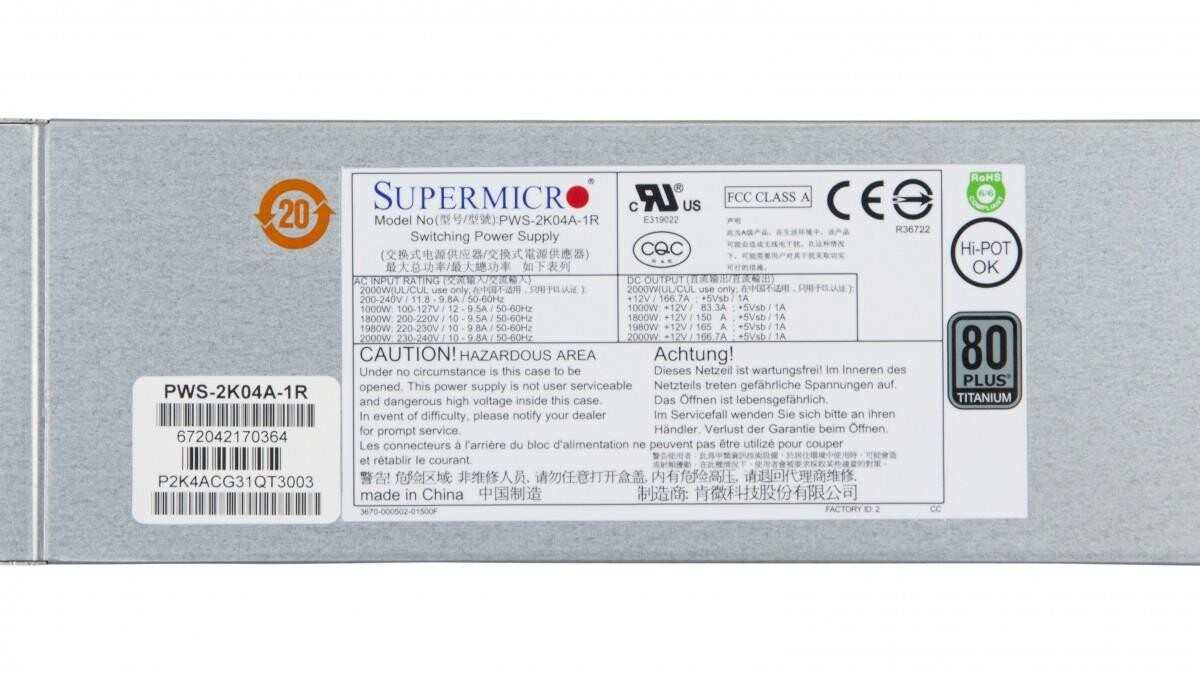 Supermicro PWS-2K04A-1R - 1000 W - 100 - 240 V - 2000 W - 50 - 60 Hz - 12 - 9.5 - 10 - 9.5 A - Aktiv