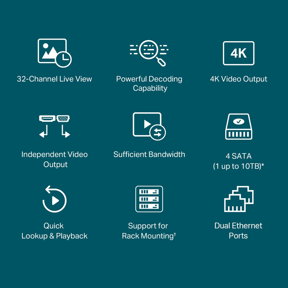 TP-LINK VIGI 32 Channel Netzwerk-Video-Recorder - 32 Kanäle - 3840 x 2160 Pixel - 16 Kanäle - 720p - 1080p - 3840 x 2160 - 1920 x 1080 - 1680 x 1050 - 1440 x 900 - 1280 x 1024 - 1280 x 720 - 1024 x 768 - H.264 - H.264+ - H.265 - H.265+