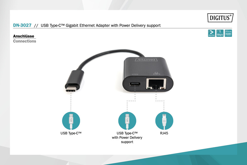 • 1 x USB-C™ Anschluss - Power Delivery (PD) 2.0 (60 W, 20 V/3 A max.) + Datenübertragung (1 Gbit/s max.)