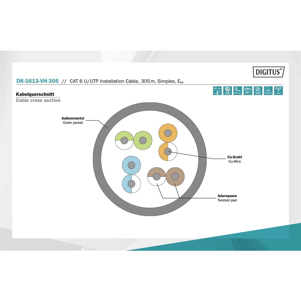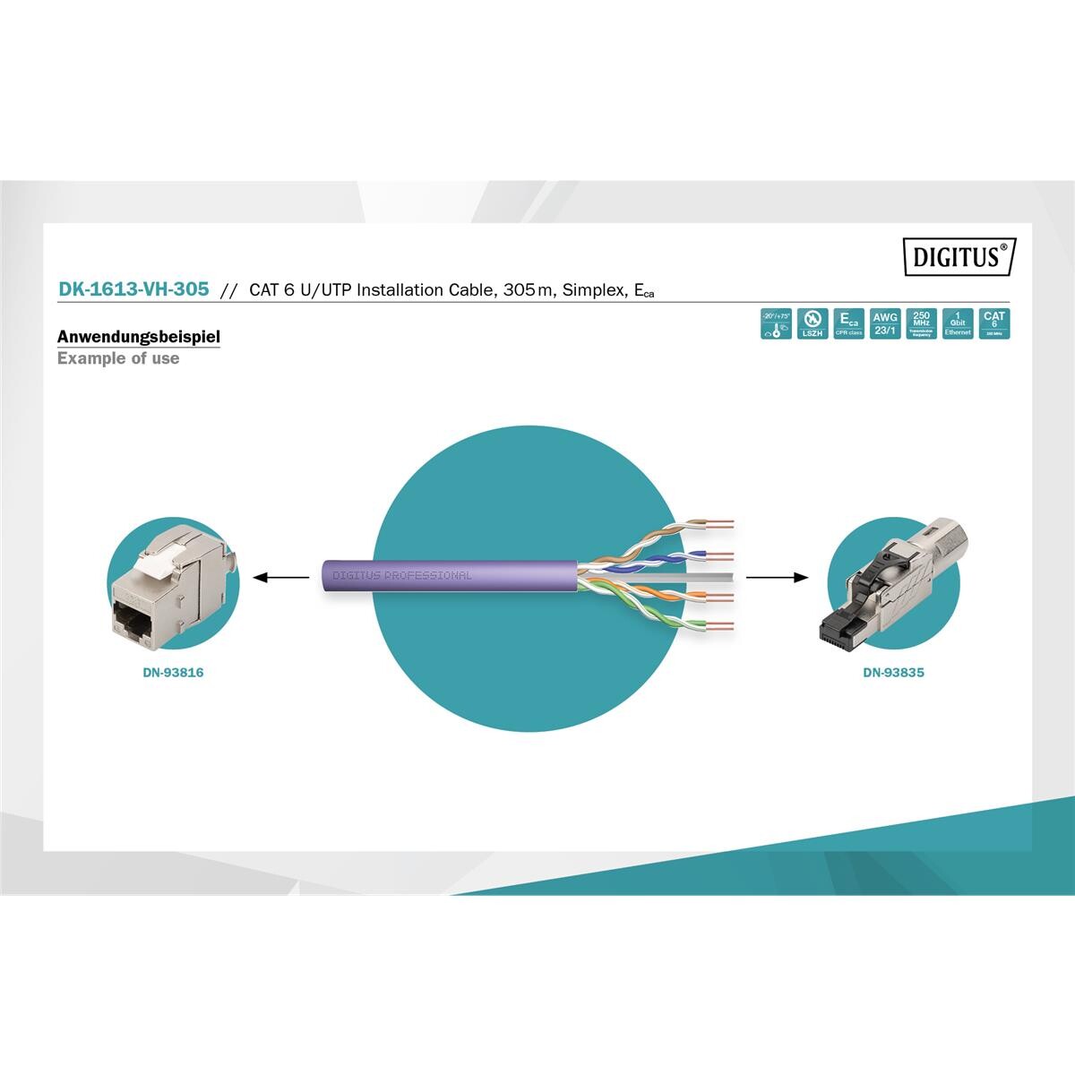 DIGITUS DK-1613-VH-305 - CAT 6 U-UTP Installationskabel, 250 MHz Eca (EN 50575), AWG 23/1, Simplex, Violett