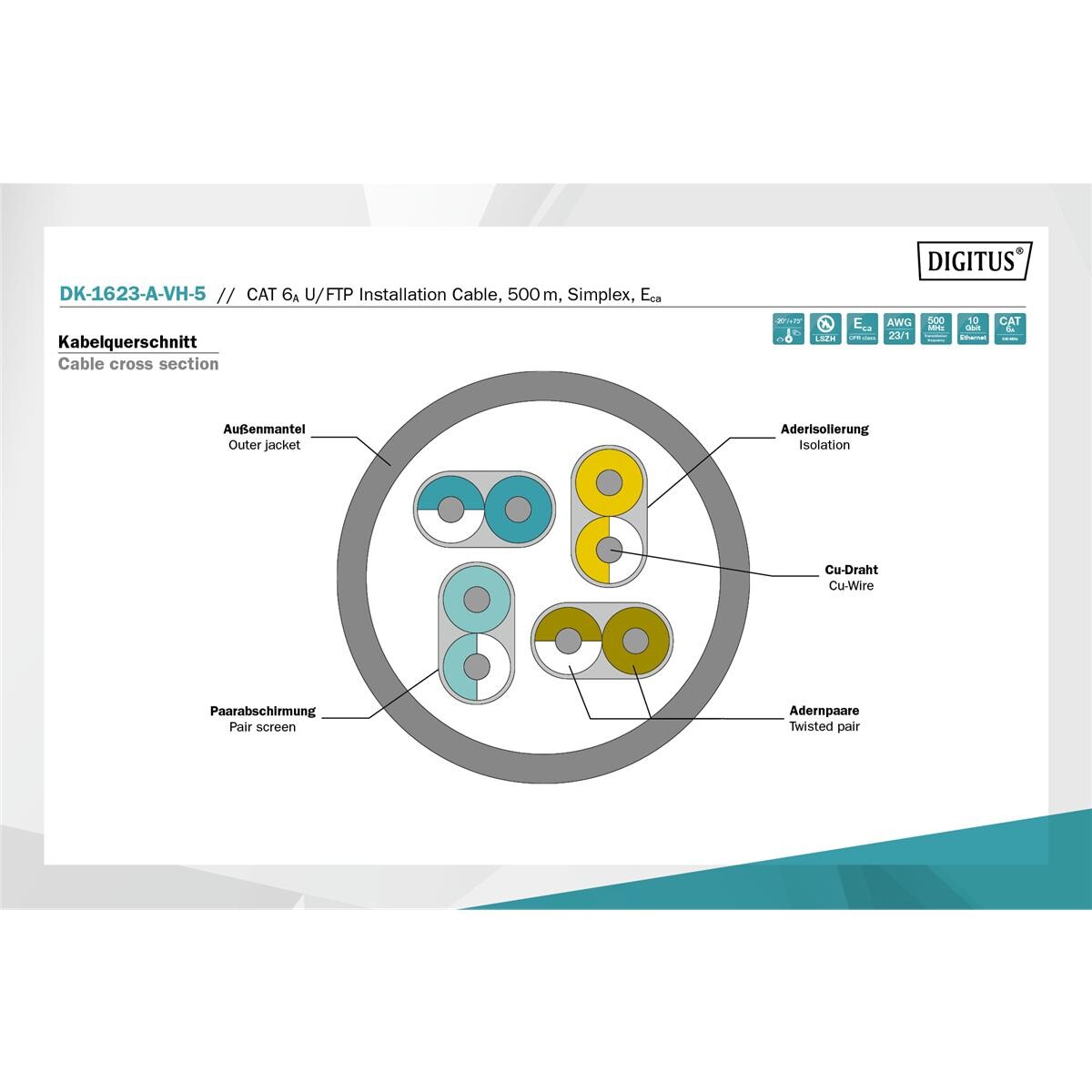 DIGITUS Netzwerk-Kabel Cat-6A - 500m U-FTP Verlege-Kabel - Simplex - Eca LSZH-1 - 500 MHz - AWG 23/1 Kupfer - Blau